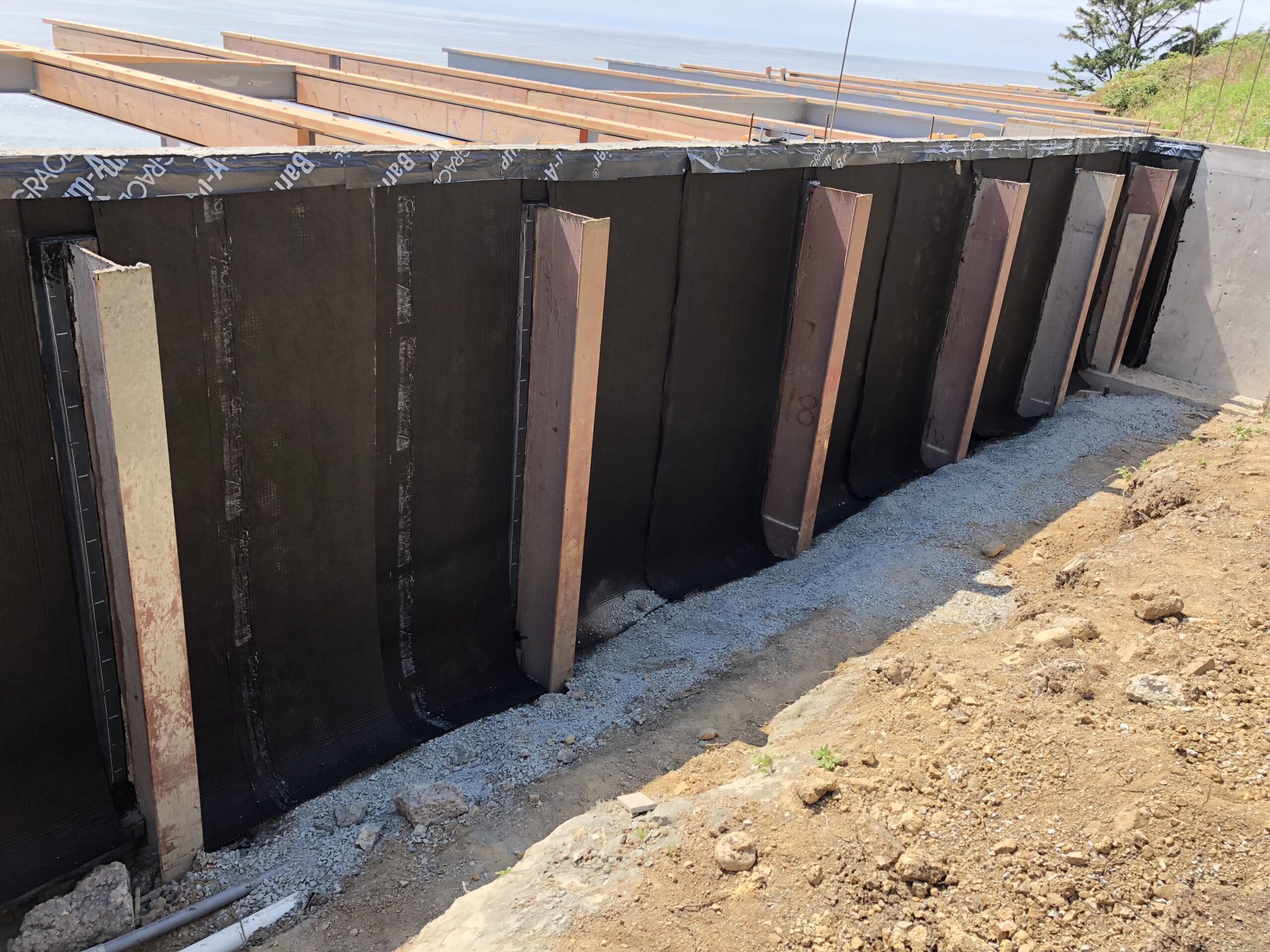 A durable waterproof membrane is applied to the foundation wall. This barrier prevents moisture from penetrating concrete surfaces below grade.